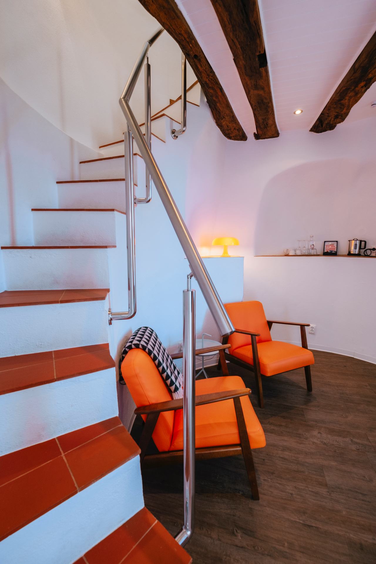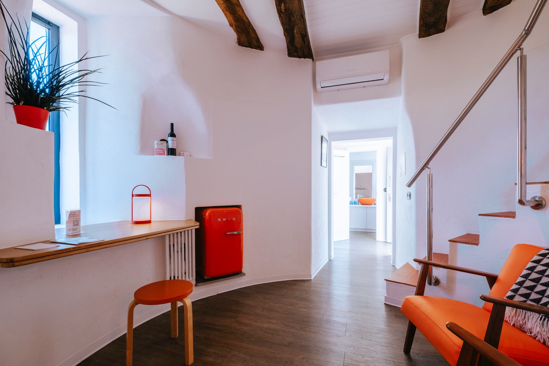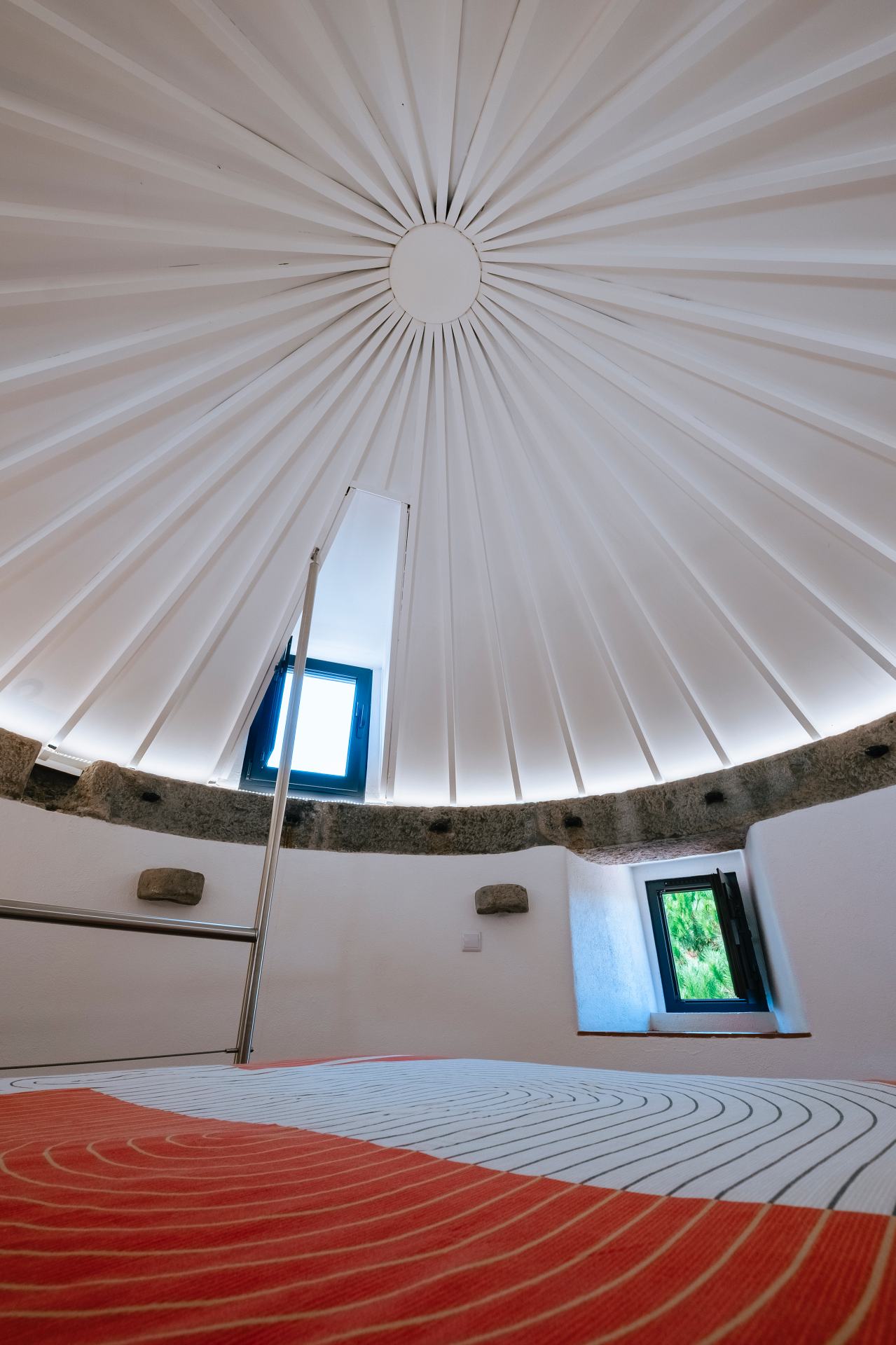 Uma escada tradicional de moleiro, equipada com um corrimão robusto em aço inoxidável para maior conforto e segurança, conduz ao quarto situado sob o autêntico teto cónico, criando um ambiente íntimo e memorável para dormir.