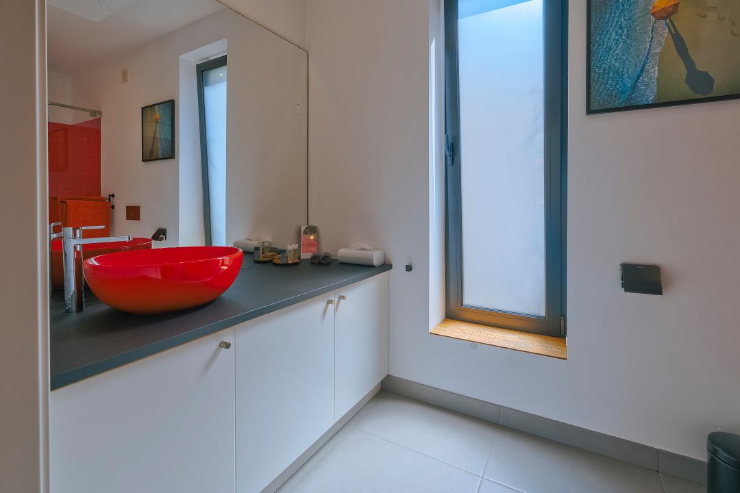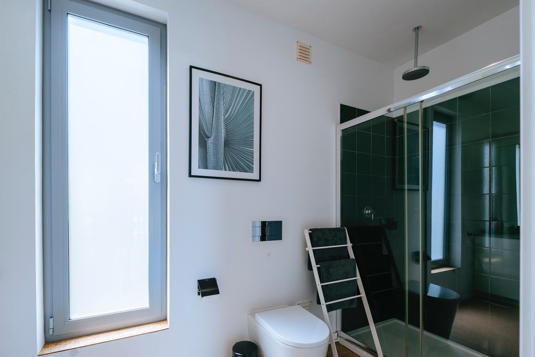Na extensão adjacente encontra-se a casa de banho, equipada com um duche tipo rain shower, lavatório e sanita.